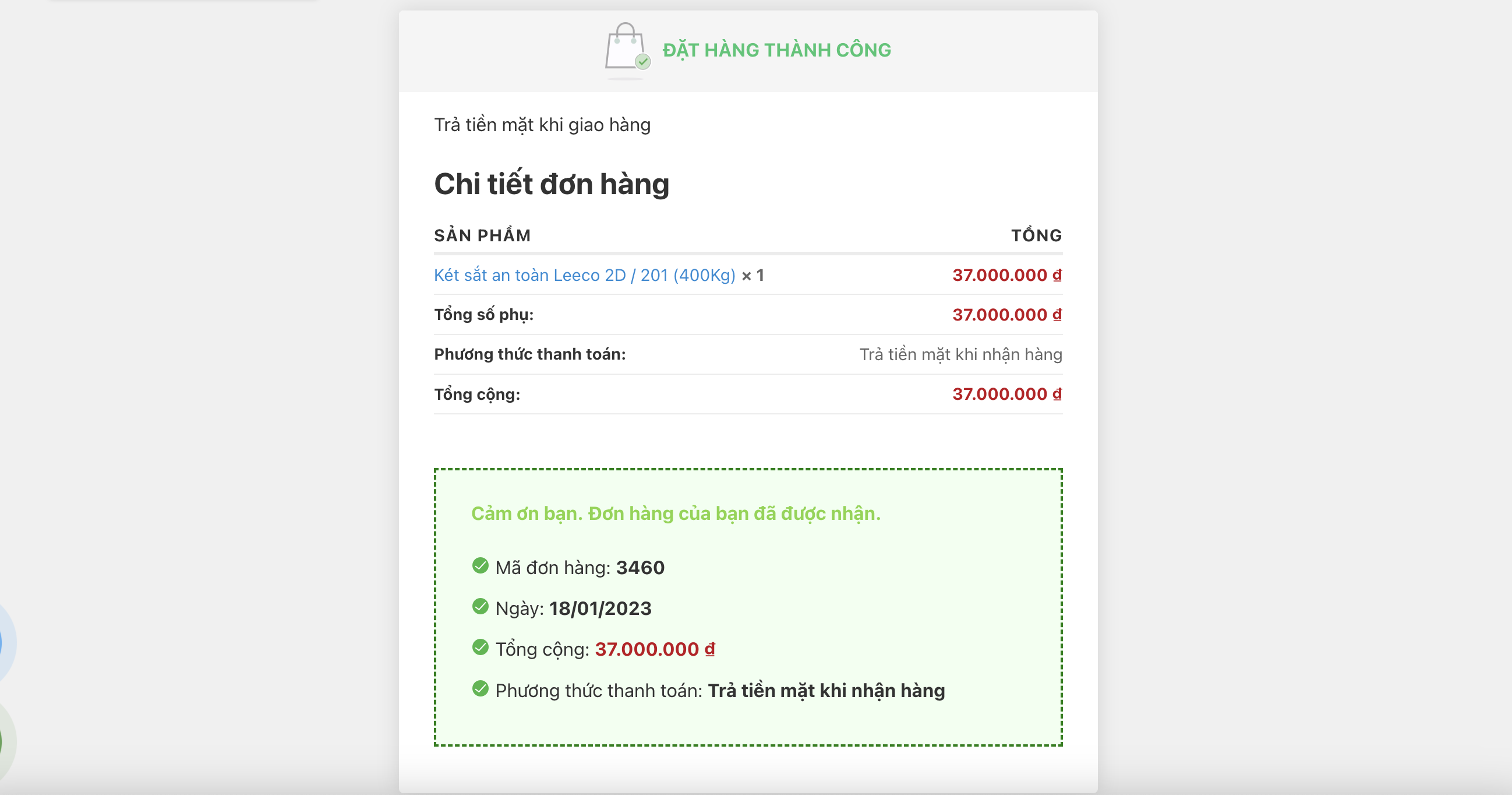 + Sau khi hoàn tất đuỗn hàng bạn sẽ nhập đước email thông báo đơn hàng đã được đặt thành công và mã đơn hàng giúp bạn theo dõi được đơn hàng ngay trên website của chúng tôi.
