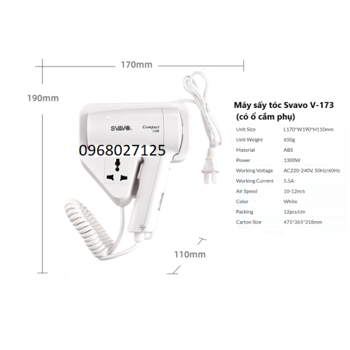 Máy sấy tóc treo tường Svavo V-173A (có tích hợp ổ cắm phụ)